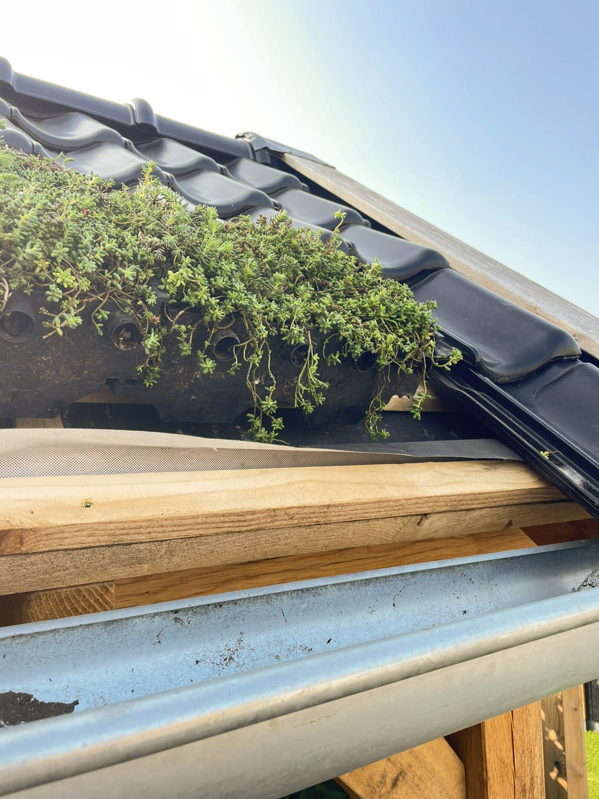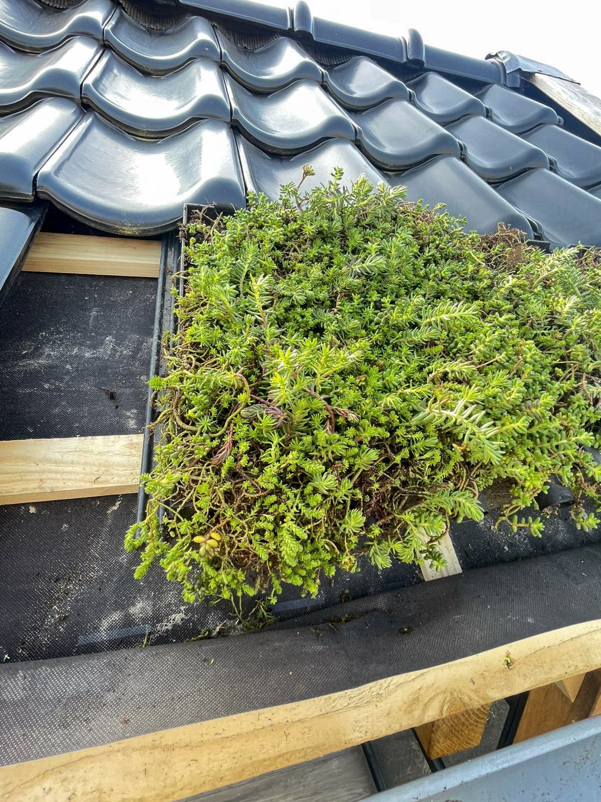 Tijdens de installatie is het belangrijk dat de zijkanten van de pannen vrij zijn van vegetatie. Na verloop van tijd groeien de sedumplanten over de zichtbare delen van de pan heen en vormt het dak één gesloten groen geheel.